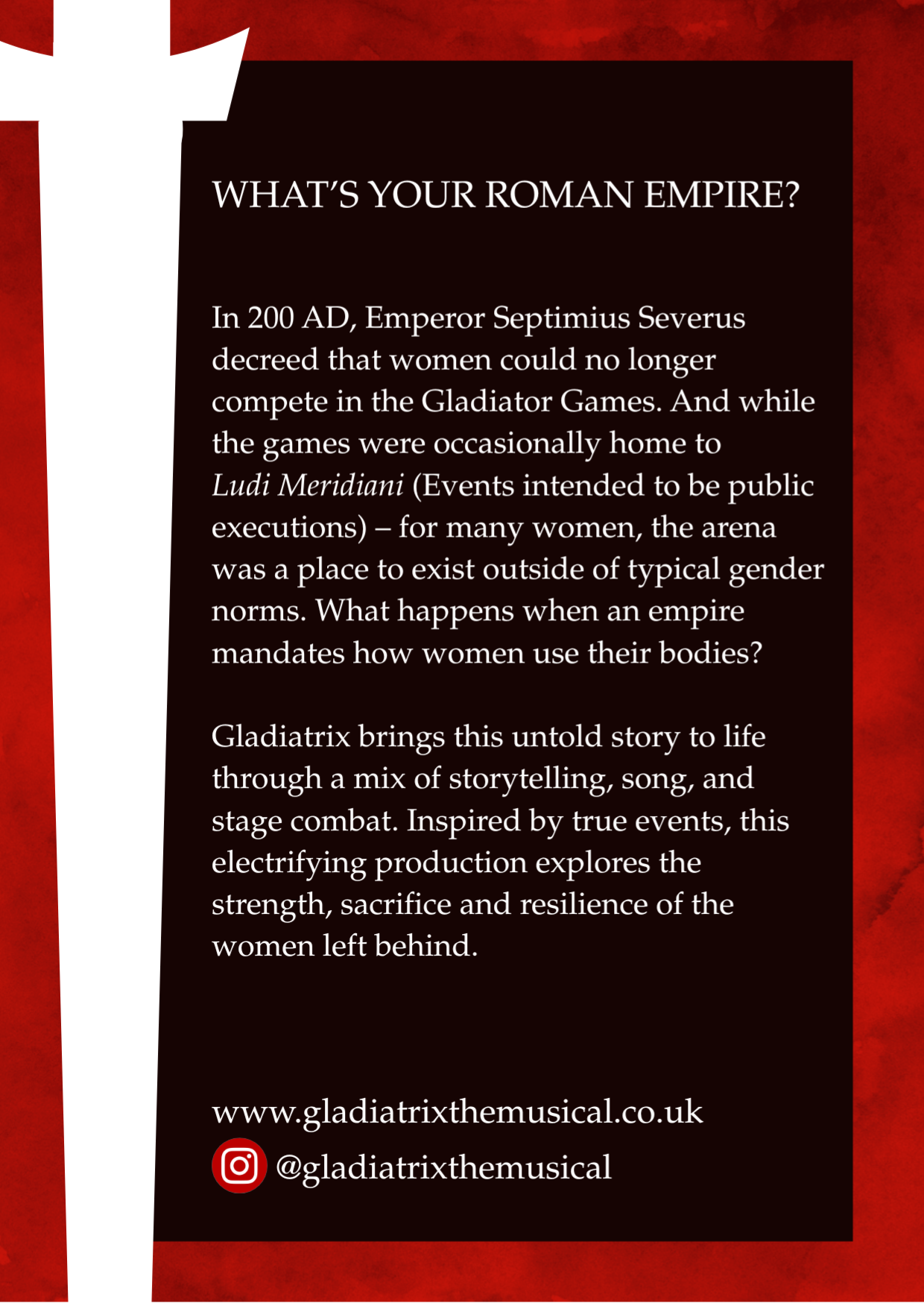 Following it's debut as a 50 minute show at 2025 Edinburgh Fringe, GLADIATRIX IS restructuring into a longer show with new songs and plenty of action. Follow us on social media or join our mailing list below to see where the show goes next!